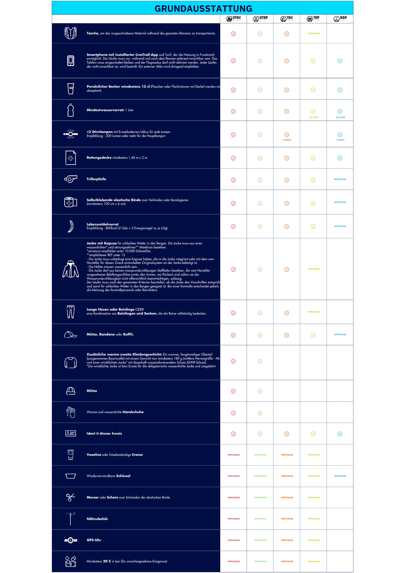 Es ist wichtig zu beachten, dass das vom Veranstalter vorgeschriebene Material ein Existenzminimum darstellt, das jeder Trailer seinen eigenen Fähigkeiten entsprechend anpassen muss. Wir empfehlen Ihnen dringend, sie bei Trainingsläufen unter verschiedenen Bedingungen zu testen und alles mitzunehmen, was Ihnen nützlich und notwendig erscheint.