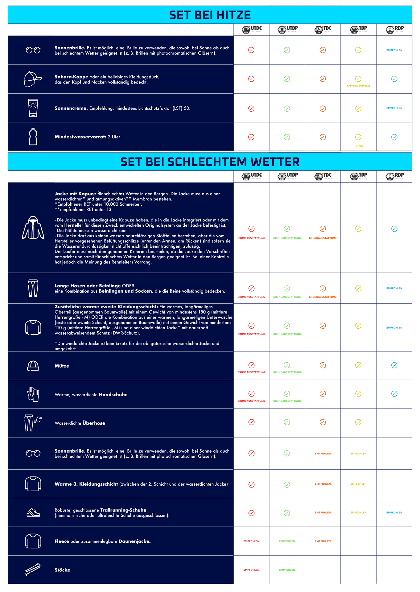 Die Sets "große Hitze" und "schlechtem Wetter" sind integraler Bestandteil der Pflichtausrüstung. Je nach Wetterbedingungen kann der Veranstalter ein Set aktivieren und informiert jeden Teilnehmer, bevor die Startnummernausgabe für sein Rennen beginnt. Jeder Teilnehmer muss dann seine Pflichtausrüstung, einschließlich des vom Veranstalter aktivierten Sets vorzeigen, um seine Startnummer abzuholen.