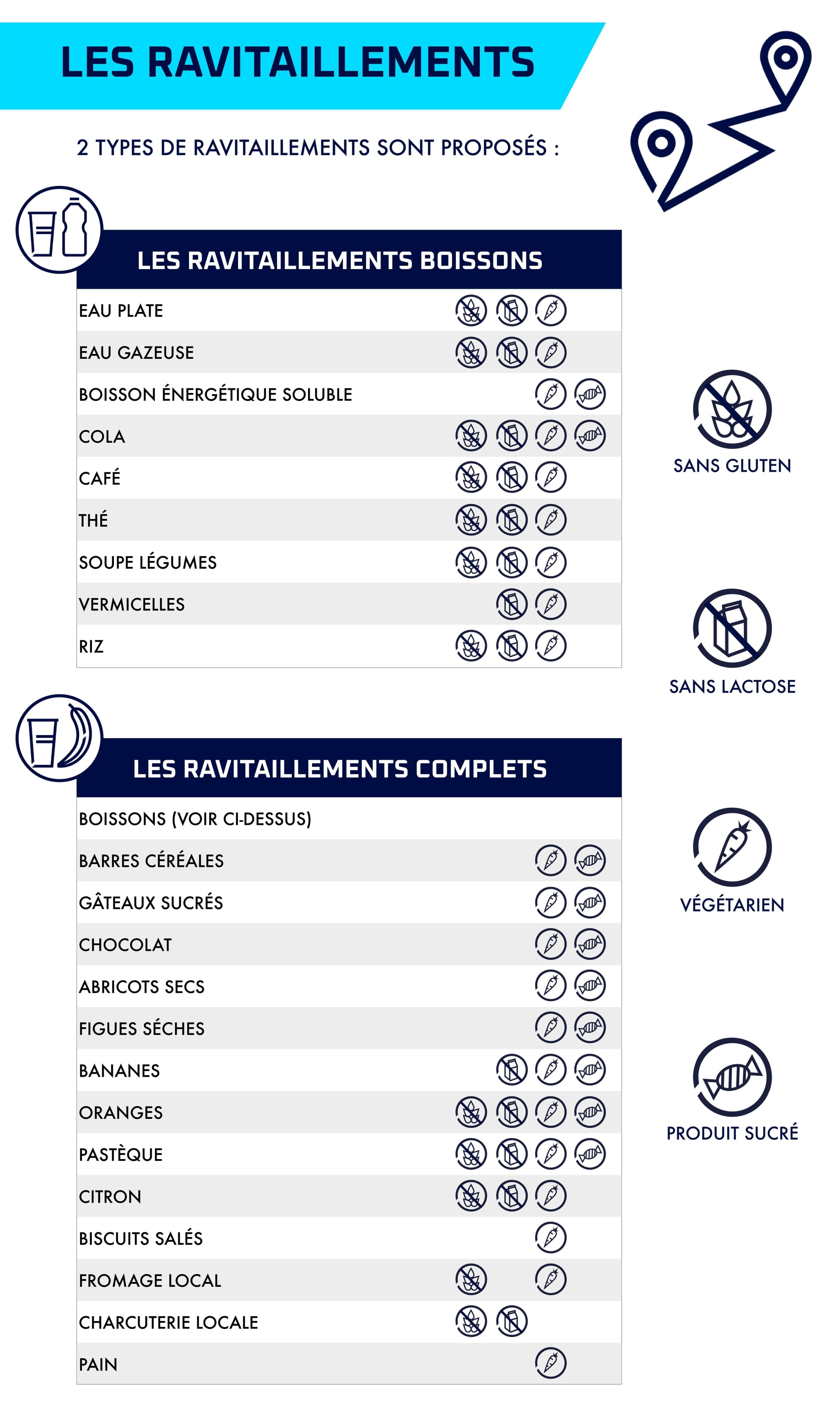 2 types de ravitaillements sont proposés : les ravitaillements en boisson uniquement et les ravitaillements complets (solides et liquides). De plus, un plat chaud est proposé à Chatenois pour l’UTDC et à Barr pour l’UTDP.